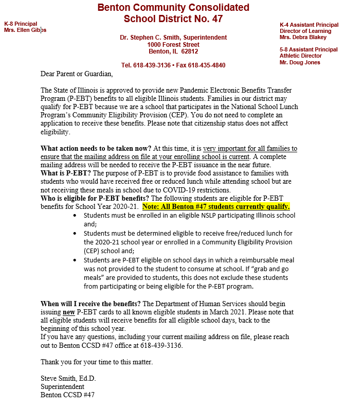 Please click on the link or see the image below to view the P-EBT letter to households.